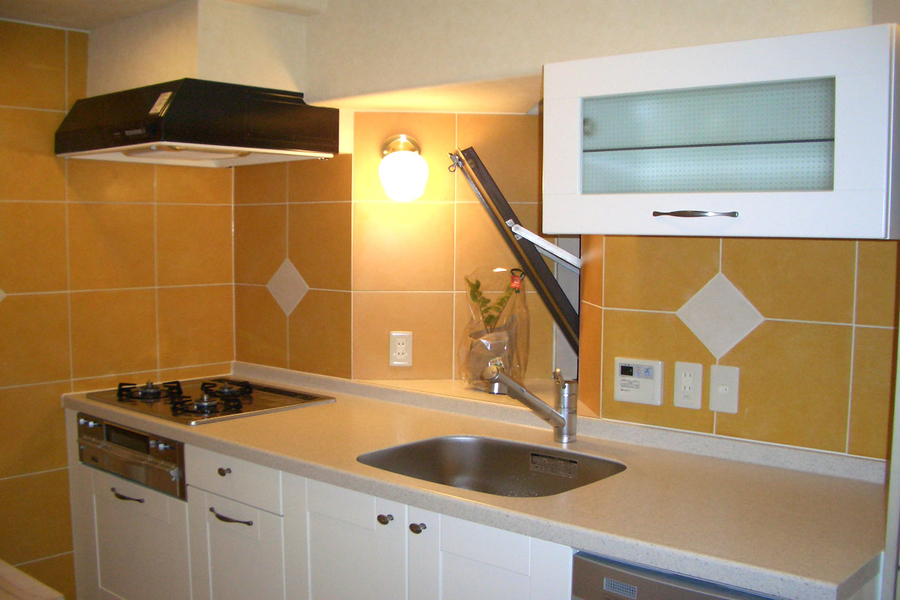 キッチンが個室で暗く、熱がこもって暑い。そのうえ、キッチンにいるとお子様達に目が届かないなど、毎日ストレスを抱えていた奥様。リビングダイニングはそのままで、動線や使い勝手を大胆に変えるプランに。キッチンルームのコーナー壁を抜いて、ここを動線・視線・風の流れに利用しました。廊下側にあったキッチンを窓側に移動させ、反対に廊下側にはこれまで煩雑に収納していたキッチングッズやストック品などを食器とともに一ヶ所に集約。壁には元気のでるビタミンカラーのタイルをコーディネートして、奥様が毎日楽しくなるキッチンをご提案しました。