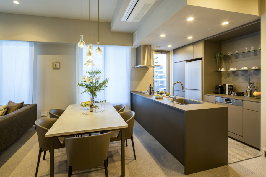 新築マンションの引き渡し時はコンロ前に壁がありましたが、オープンキッチンにして視界が広がるLDKとなりました。キッチンカウンターや、サイド&フロントパネルにマット仕上げのクォーツカウンター材を採用し、家具のような柔らかな印象のオーダーキッチンを設計製作しました。オーダー製作したダイニングテーブルの脚の色、ダイニングチェアのレザー張りの色もキッチンとコーディネートしています。